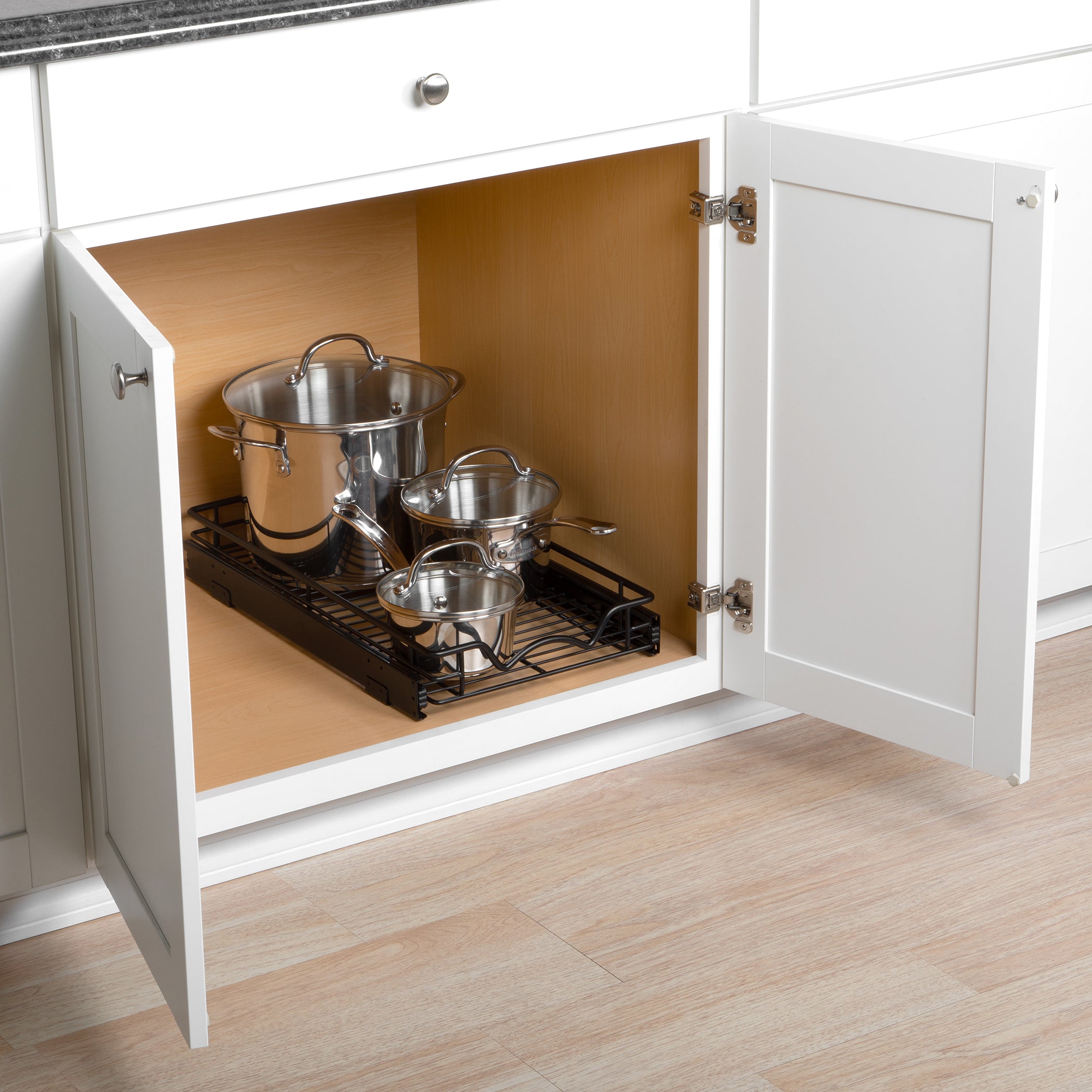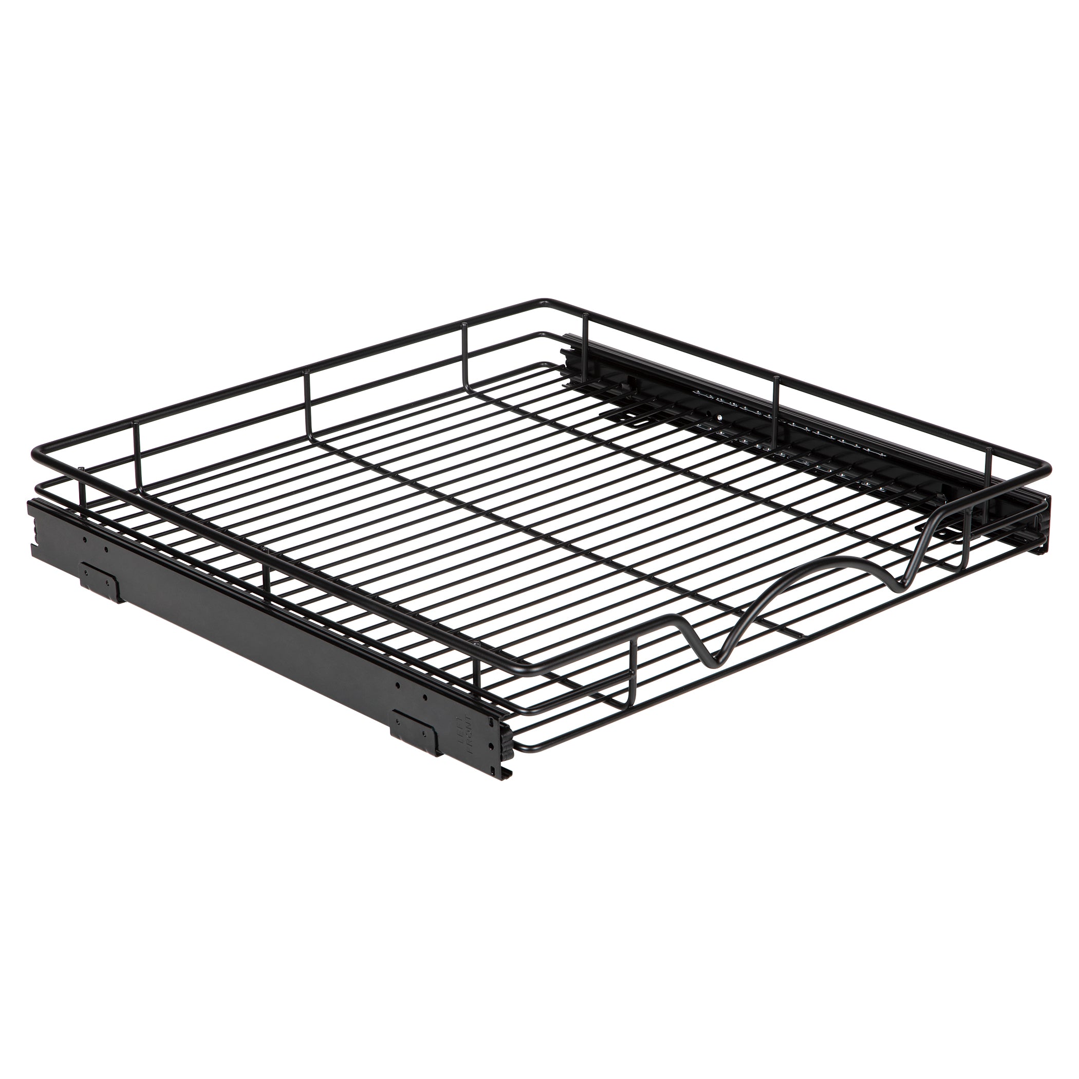 The Hold N' Storage Pull Out Cabinet Organizer is a durable and stylish solution for your kitchen storage needs, featuring heavy-duty metal construction with an ultra-smooth sliding system. Measuring 14”W x 21”D x 3.15"H, it requires a cabinet opening of at least 15.25” and includes a ball-bearing system for easy, full-extension access. The organizer’s robust gauge wire design ensures it can handle a substantial amount of cookware, while its sleek black finish adds a touch of elegance to any cabinet.