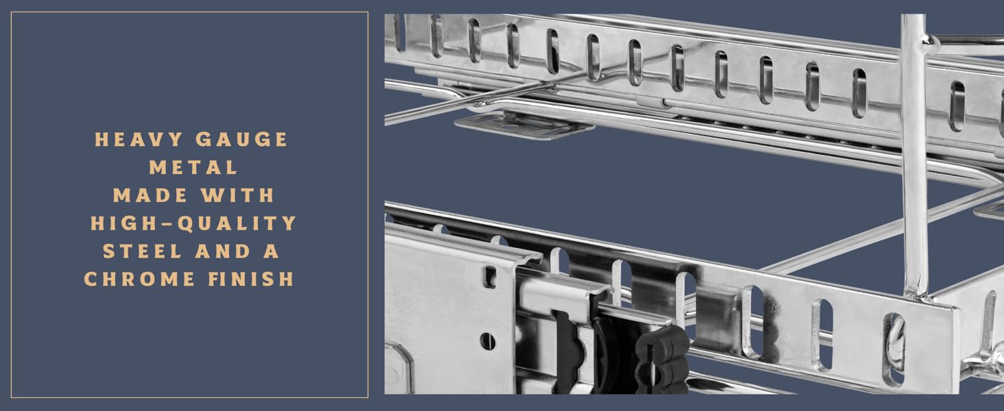 The Hold N' Storage Pull-Out Trash Can Under Cabinet System combines durability and functionality with its premium steel construction and anti-rust chrome finish. Measuring 10.5"W x 21"D, requires a cabinet opening...